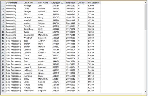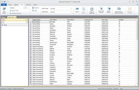 Figure 19-7. Monarch’s Table view is populated with the data imported from Employ.mdb – Employee Roster.