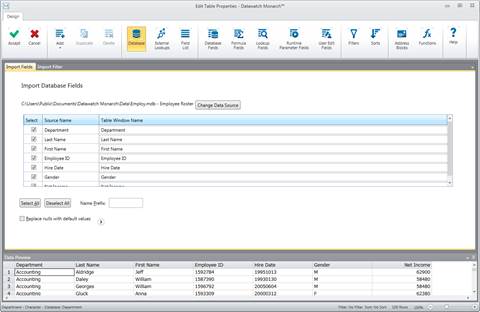 You can also add a name prefix to one or more of the import column names. To do so, however, you must enter the prefix in the Name Prefix box before selecting any of the columns to import. After specifying the prefix, you can then either click the Select All button or select individual columns via their check boxes. The names for the columns you chose to import will then be displayed, preceded by the name prefix (e.g., if you specified a Name Prefix of “Test”, for example, the import column name for the “Department” source column would be “TestDepartment.”
