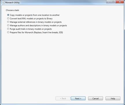 2. Select the button Copy models or projects from one location to another from the Monarch Utility wizard that displays. Click Next.