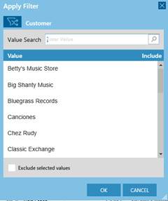 5. Under Value, select Betty’s Music Store, Big Shanty Music, Bluegrass Records, Canciones, and Chez Rudy.