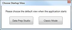 When you specify Classic Mode as the startup view, sessions after the current one will automatically display the Monach Classic view when the application is run. Conversely, if you specify Data Prep Studio as the startup view, all sessions after the current one will automatically display the Data Prep Studio view when the application is run.
