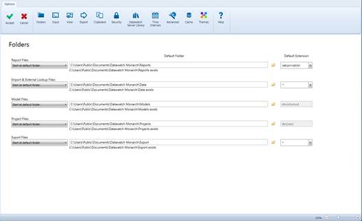 The Options interface allows users to configure several universal Monarch settings, including Folders, input information, views, and exports, among others.