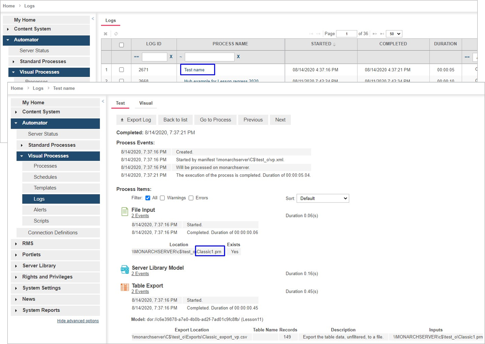 NOTE: The process name in the XML file (“Test name” in the example above) should be the same as the name of the Visual Process created.