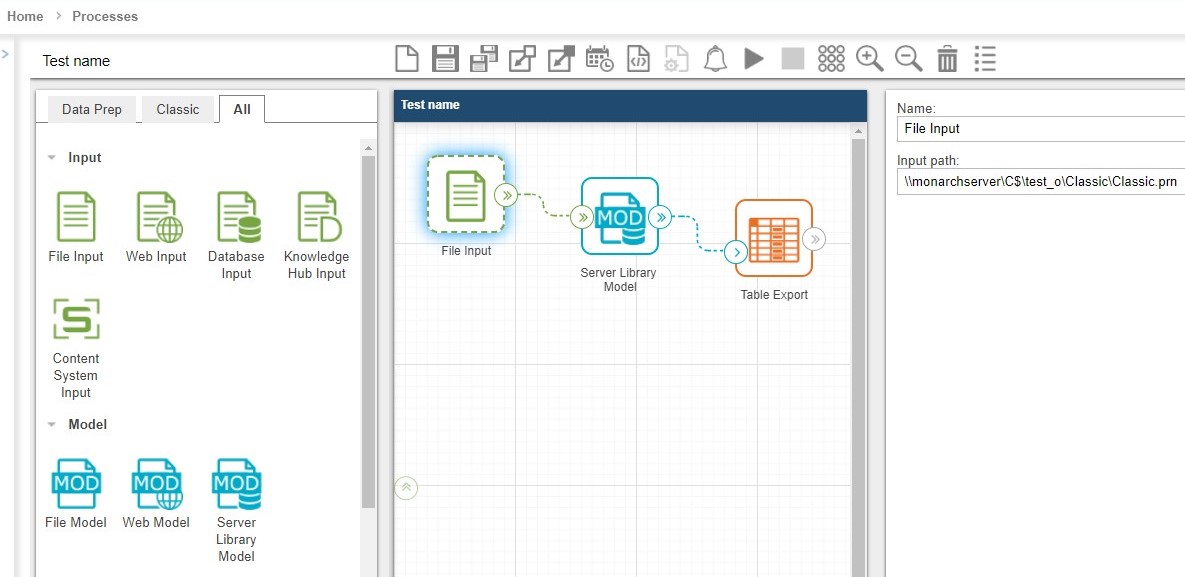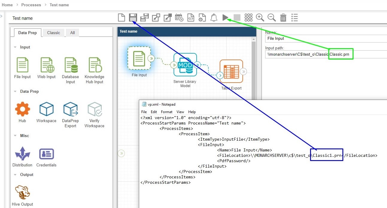 NOTE: If you are using the input file specified in the xml file you created in the beginning (Classic1.prn in the manifest xml example above), click the Save icon  only. When the xml file is found, the process will run automatically. If you are using the general file input (Classic.prn), click the Save and Run icon instead.
