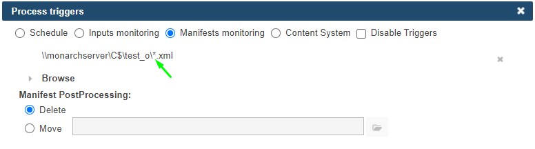 • When a new manifest monitoring file is added to the folder after using a wildcard (* or ?) in triggers