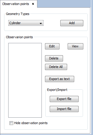 - Check the Hide observation points option to hide the observation points from the main geometry window but without deleting them. Disable this option to show the observation points.
