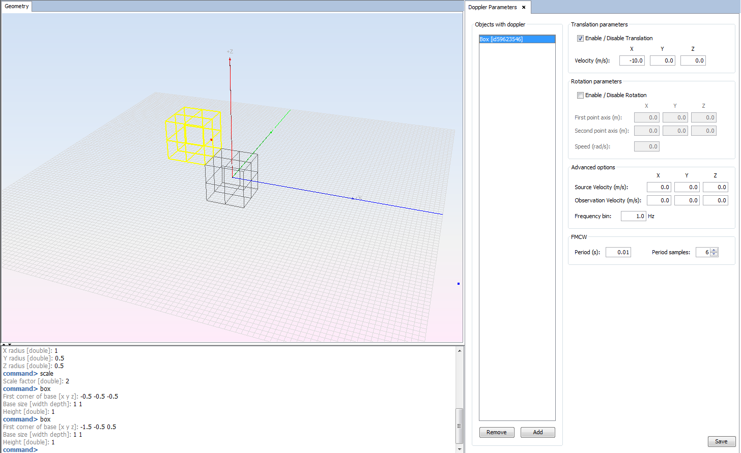 Now Doppler option in the Simulation menu is available. Click on Simulation -> Doppler. We are going to add doppler effects to the objects in the geometry. Select one box and press the Add button. The selected object is added to the list. Introduce the linear velocity of this object: