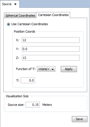 Click on Source -> Parameters to modify the source parameters for this project. Define its position in Cartesian coordinates