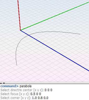 This option allows the user to create a parabola. The parameters to this function are directrix center point of the parabola, focus point and corner point. The directrix point determines the axis of symmetry of the parabola. The focus of a parabola is a fixed point on the interior of a parabola used in the formal definition of the curve . The end point determines the length and curvature of the parabola.