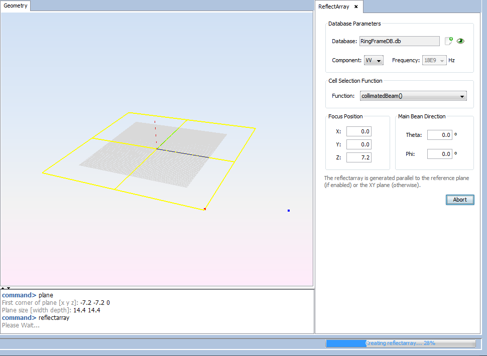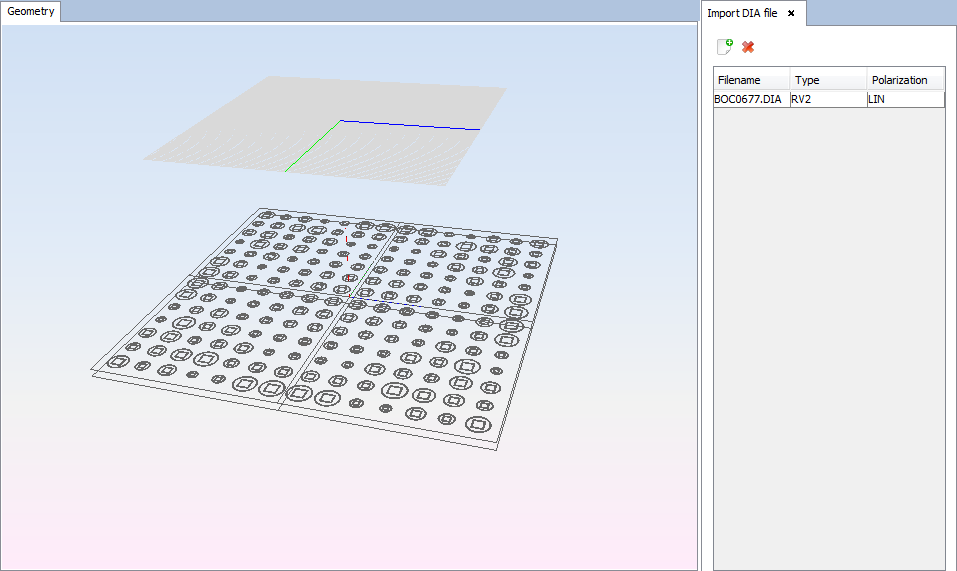 Select the plane previously created to generate the reflectarray over it. The reflectarray layout is generated placing in each cell the structure of geometries with the phase value closest to the phase value calculated by the user-selected function for this purpose. Then, click on 'Create' button and wait until the reflectarray layout is created.