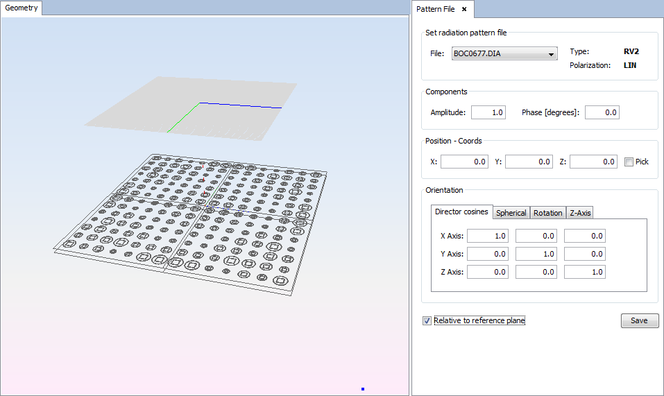 Select 'Source --> Pattern File --> Pattern File Antenna' option and set the parameters as show the next figure. Then save the parameters and the antenna appears.