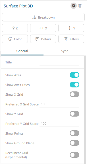 Grid lines, a ground plane, and markers for data points can be shown if required.