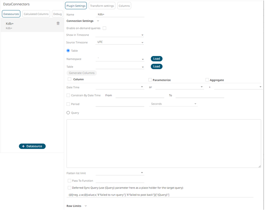1. Select Kdb+ from the Data Sources pane. The Kdb+ Settings pane and the retrieved Kdb+ source are displayed.