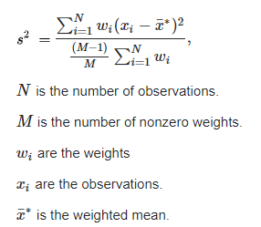The formula used for calculation of the weighted sample Standard Deviation (“Weighted Stdev”) and weighted sample Variance (“Weighted Variance”) is the following, defined by NIST.gov, National Institute of Standards and Technology: