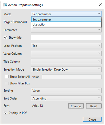 The Action Dropdown allows the selection of the parameter value that will be used by the action.