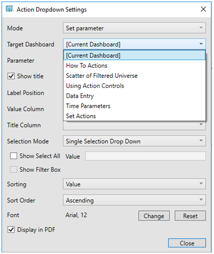 The default is Current Dashboard. When copying the Action control to another dashboard or workbook, the target dashboard is automatically set to the new dashboard instead of where it was originally located.