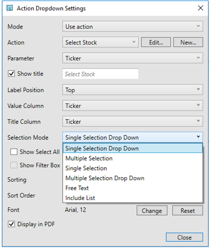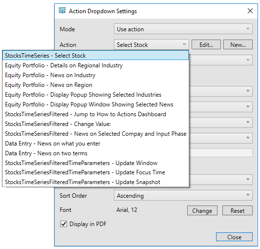 The Action Dropdown Settings dialog displays.
