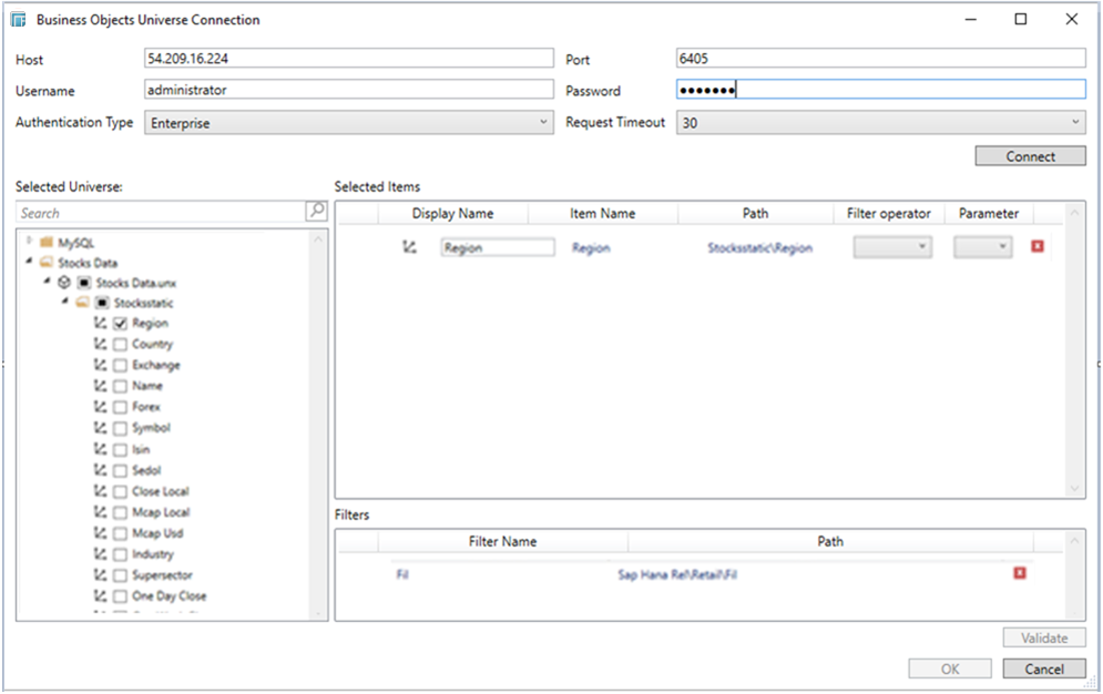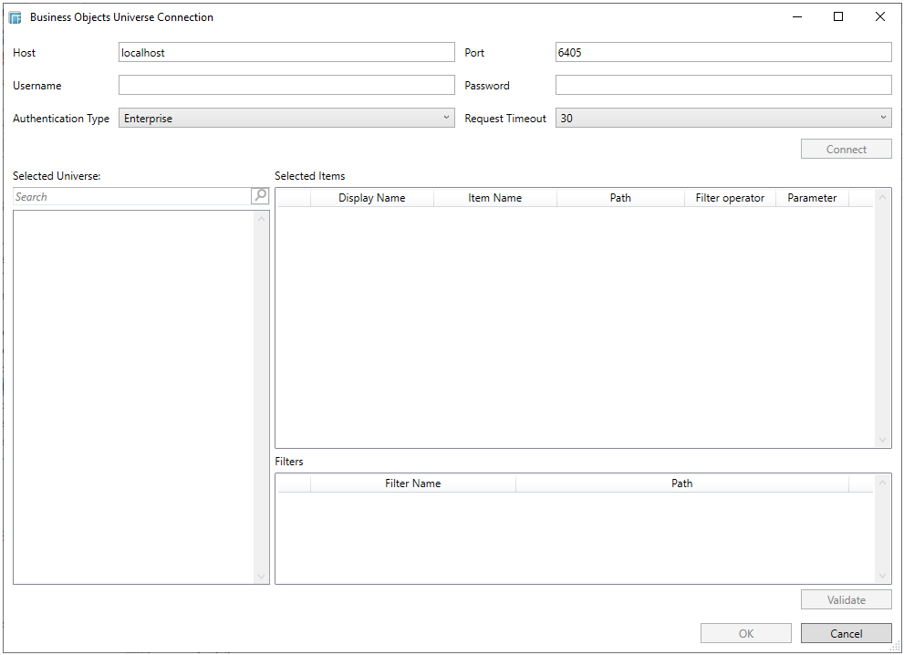 The Business Objects Universe connector allows you to connect to your SAP Business Objects Universe.