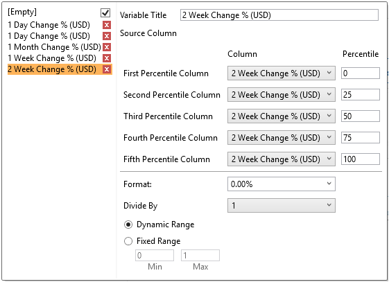 The visible range for the variable can either be calculated dynamically (the default, Dynamic Range) or set between predefined limits by selecting Fixed Range radio button. This reveals the Min and Max text boxes and populates them with default values taken from the data set.