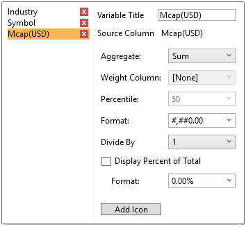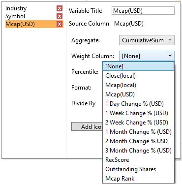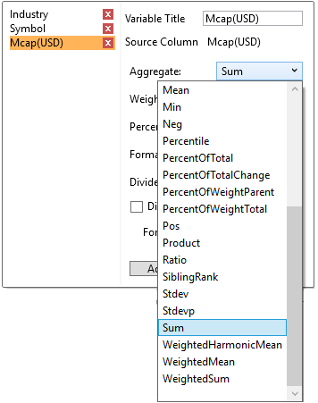 If you set the aggregation method to Cumulative Sum, Cumulative Sum By Max, Ratio, Percent of Weight Parent, Percent Weight of Total, Weighted Harmonic Mean, Weighted Mean, or Weighted Sum, the Weight Column drop-down list is enabled that allows you to select the weight column to be used.