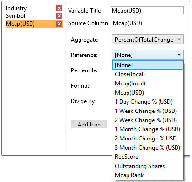 If you set the aggregation method to Percent of Total Change, the Reference is enabled that allows you to select a reference column to use.
