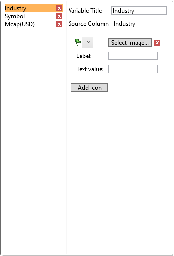 To associate columns from the data table, drag and drop them to the Icons variable area.
