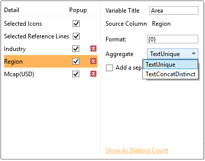 The Details Variable controls the information that appears on the pop-up when hovering over a specific item within a visualization. It also controls the information available for export from the visualization.