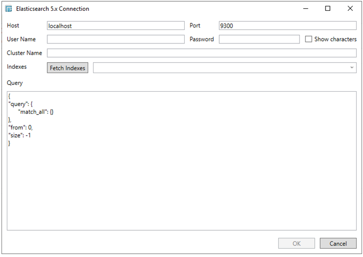 When creating a new data table, select Elasticsearch 5.x from the Connect to data dialog. The ElasticSearch 5.x Connection dialog displays.