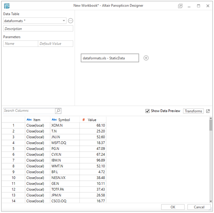 Select the Data Table you want to use for a time series display and click Transforms in the Data Preview area: