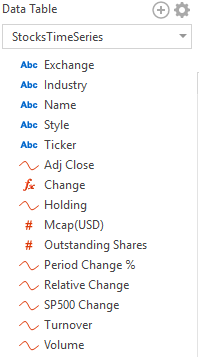 Once saved, a time series data table is visually identified by the time series curve to the left of any numeric time series fields.