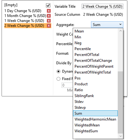 If you set the aggregation method to Cumulative Sum, Cumulative Sum By Max, Ratio, Percent of Weight Parent, Percent Weight of Total, Weighted Harmonic Mean, Weighted Mean, or Weighted Sum, the Weight Column drop-down list is enabled that allows you to select the weight column to be used.