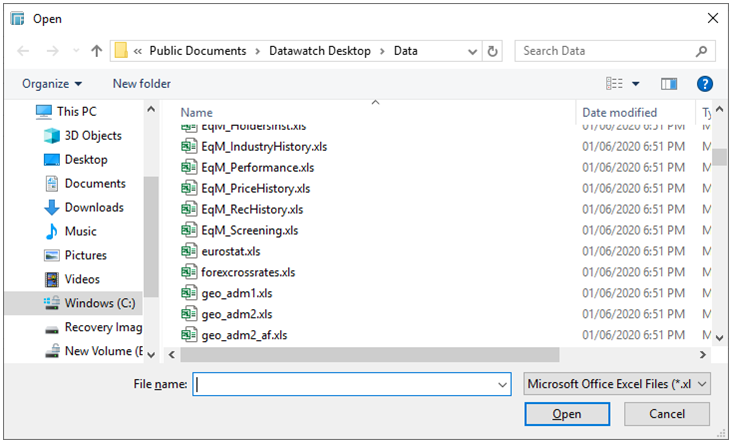 When creating a new data table, select MS Excel from the Connect to data dialog. The list of Excel files is displayed.