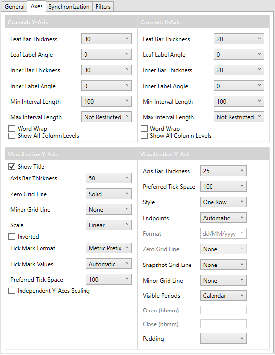 Refer to Cross Tab Axes, Visualizations Axes, and Time Axes for more information.