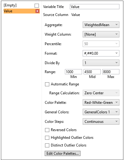 When you add a numeric column to a Color variable, the configuration panel displays a set of options similar to the panel for the Height variable. This allows you to define the data display format and aggregation method.