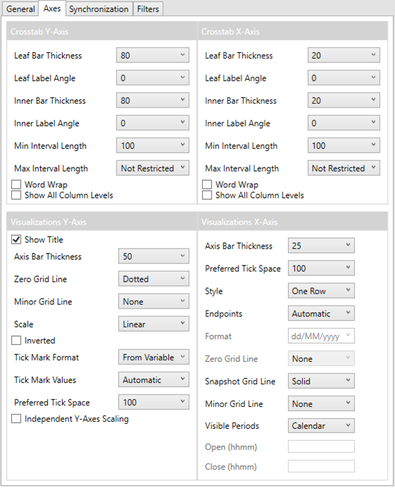 Refer to Cross Tab Axes, Visualizations Axes, and Time Axes for more information.