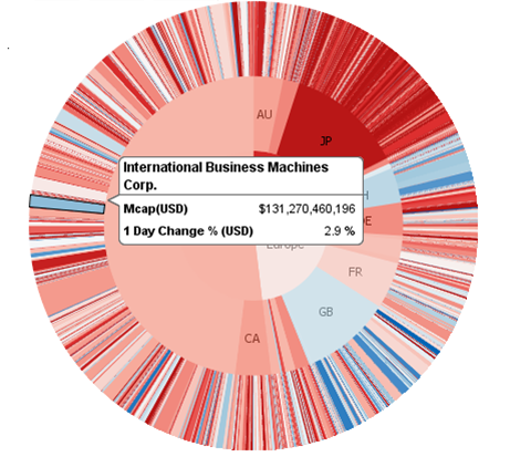 Panopticon Designer can produce standard Pie Charts in which the pie slice represents a numeric variable that is proportional to the total size of the pie. The color variable can represent either a category or another numeric variable.