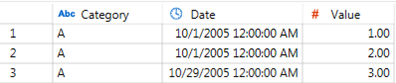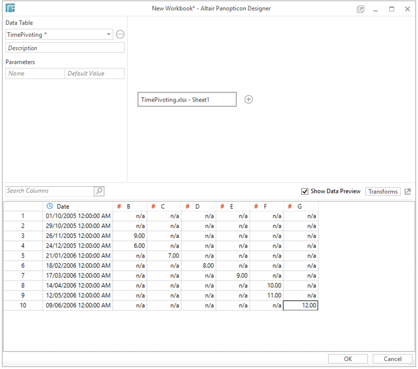 The Date column has been automatically chosen for the Category column as displayed at the bottom section of the dialog. Clicking OK transforms the data and is displayed in the Edit Data Table view.