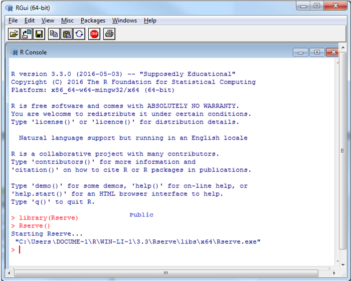Load the created configuration file (the default Rserve configuration file is still loaded, but its settings have lower priority) and run Rserve: