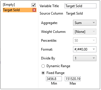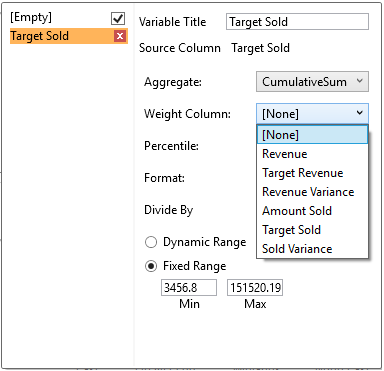 If you set the aggregation method to Cumulative Sum, Cumulative Sum By Max, Ratio, Percent of Weight Parent, Percent Weight of Total, Weighted Harmonic Mean, Weighted Mean, or Weighted Sum, the Weight Column drop-down list is enabled that allows you to select the weight column to be used.