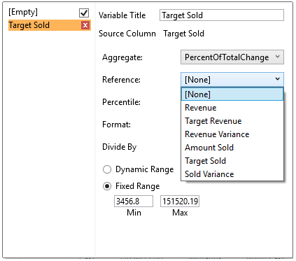 If you set the aggregation method to Percent of Total Change, the Reference is enabled that allows you to select a reference column to use.