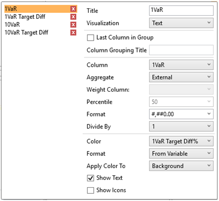 When working with financial risk data, especially Value at Risk (VaR), the data will be by definition non-additive, and cannot be calculated internally within Panopticon Designer (Desktop).  As a consequence, we allow aggregates to be retrieved in addition to the base data set. Configuration of the External aggregate can be supplied explicitly by the user or implicitly from the data plug-in.