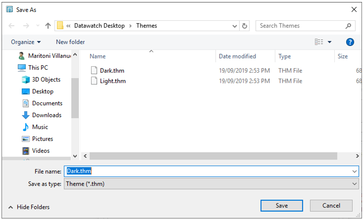 After modifying the properties of a workbook theme, click Save As.