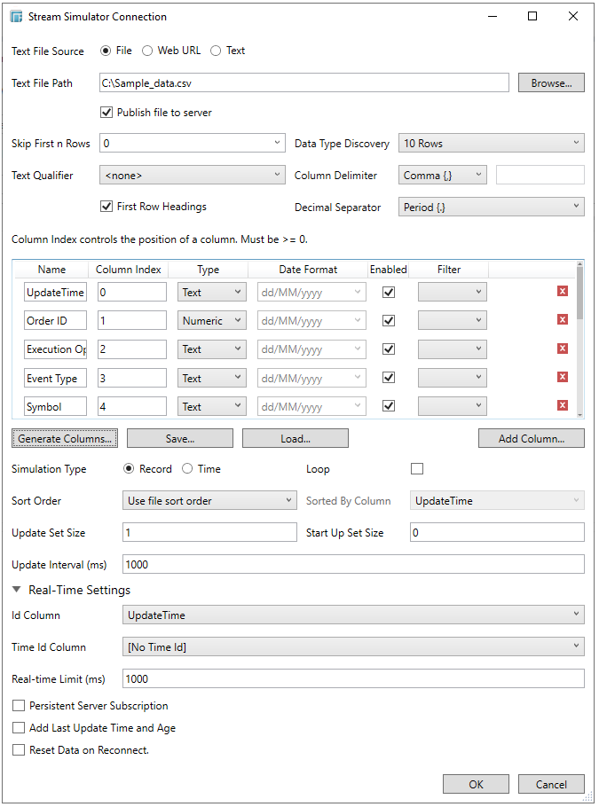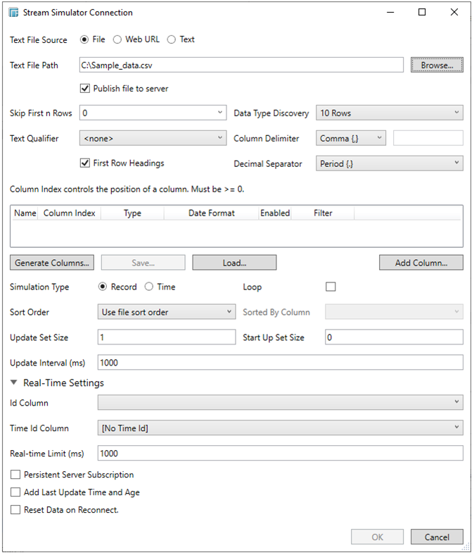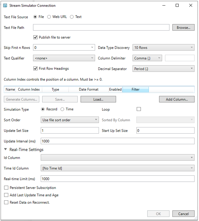 When creating a new data table, select Stream Simulator from the Connect to data dialog. The Stream Simulator Connection dialog is displayed:
