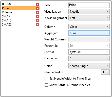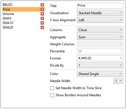 The Timeseries Combination visualization operates in a similar way to the Table. Instead of multiple input variables becoming different columns in a table, they become different layers in the time series combination visualization. Therefore, unlike other visualizations, it can display a large number of time series variables, which can be rendered as: Line, Candle Stick, Needle, OHLC, Spread, Stack & Stacked Needle.