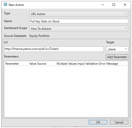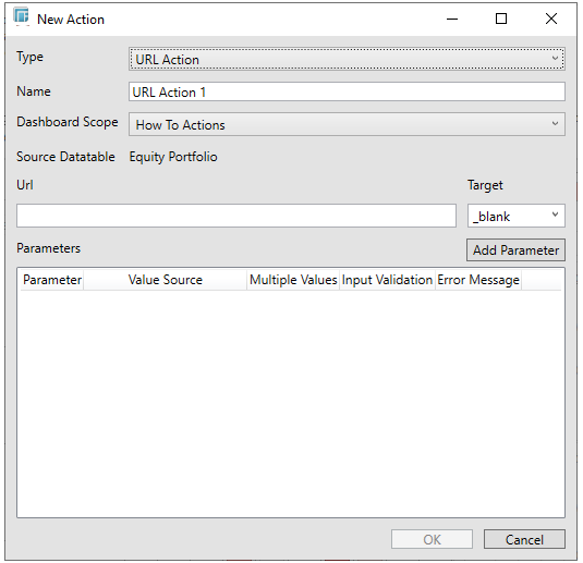 URL Actions are screated through the New Actions dialog window.