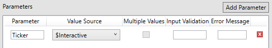If you selected an interactive parameter (i.e., $Interactive), the Input Validation and Error Message boxes are enabled.