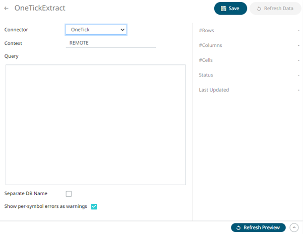 1. On the New Data Extract page, select OneTick in the Connector drop-down list.