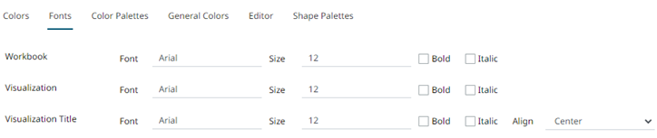 6. For the workbooks, visualization and visualization titles, enter the preferred font Type and Size and check the style boxes: Bold and Italic.