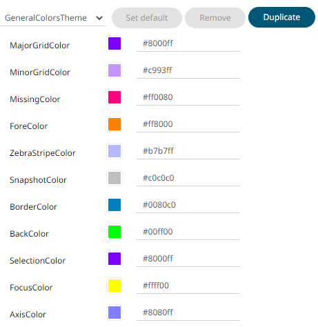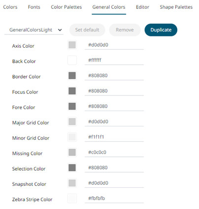 Select or specify the new general colors: AxisColor, BackColor, BorderColor, FocusColor, ForeColor, MajorGridColor, MinorGridColor, MissingColor, SelectionColor. SnapshotColor,ZebraStripeColor.