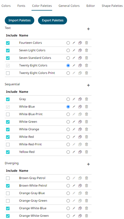 For more information on how to create, modify, duplicate, or delete Text, Sequential, or Diverging Palettes, refer to the sections below.